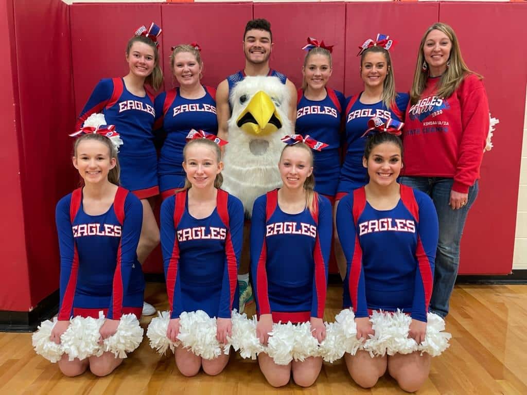 The Canton-Galva Cheer squad includes Captain Gracie Kidd (Sr.), Taygen O’Hara (Sr.), Brecken Pearson (Jr.), Brinley Becker (So.), Emma Herrera (So.), Emily Lance (So.), Emma Anderson (Fr.), and Faith Laude (Fr.). SOAR the mascot is Xavier Westbrook (Sr.).